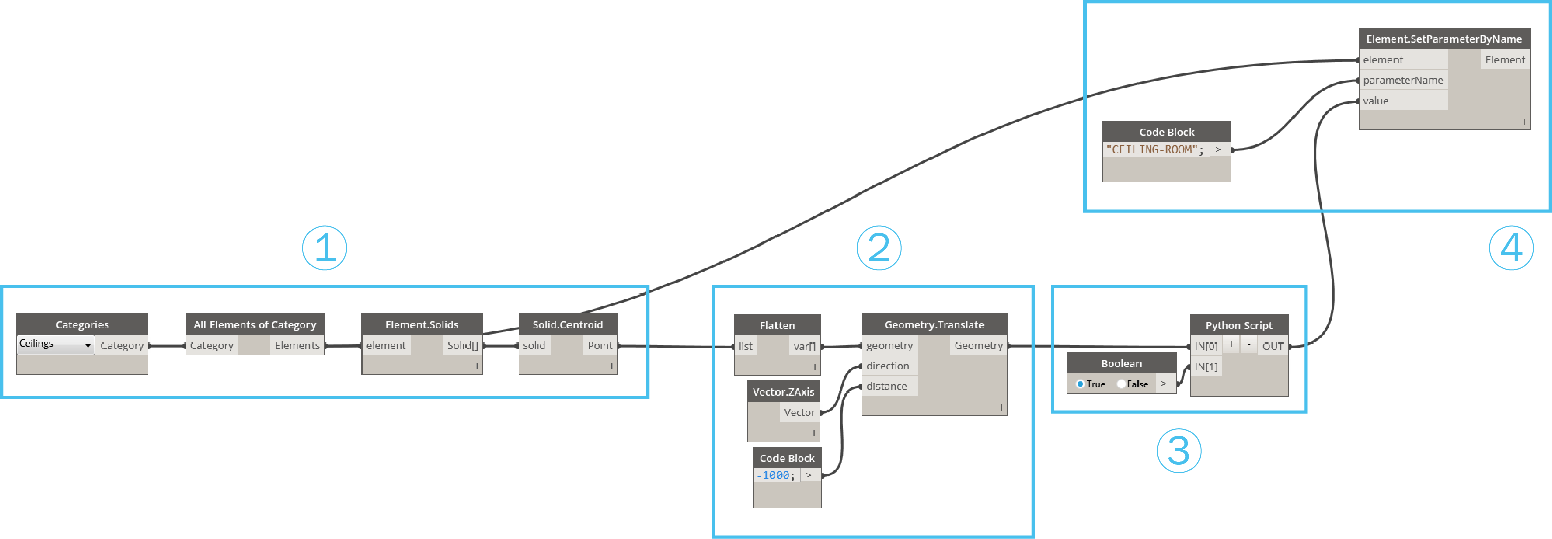 The second part of this script basically moves the points we retrieved using Solid.Centroid down in the ZAxis by 1000mm by using Geometry.Translate. This is to make sure the point is within the room area and not situated on the boundary.