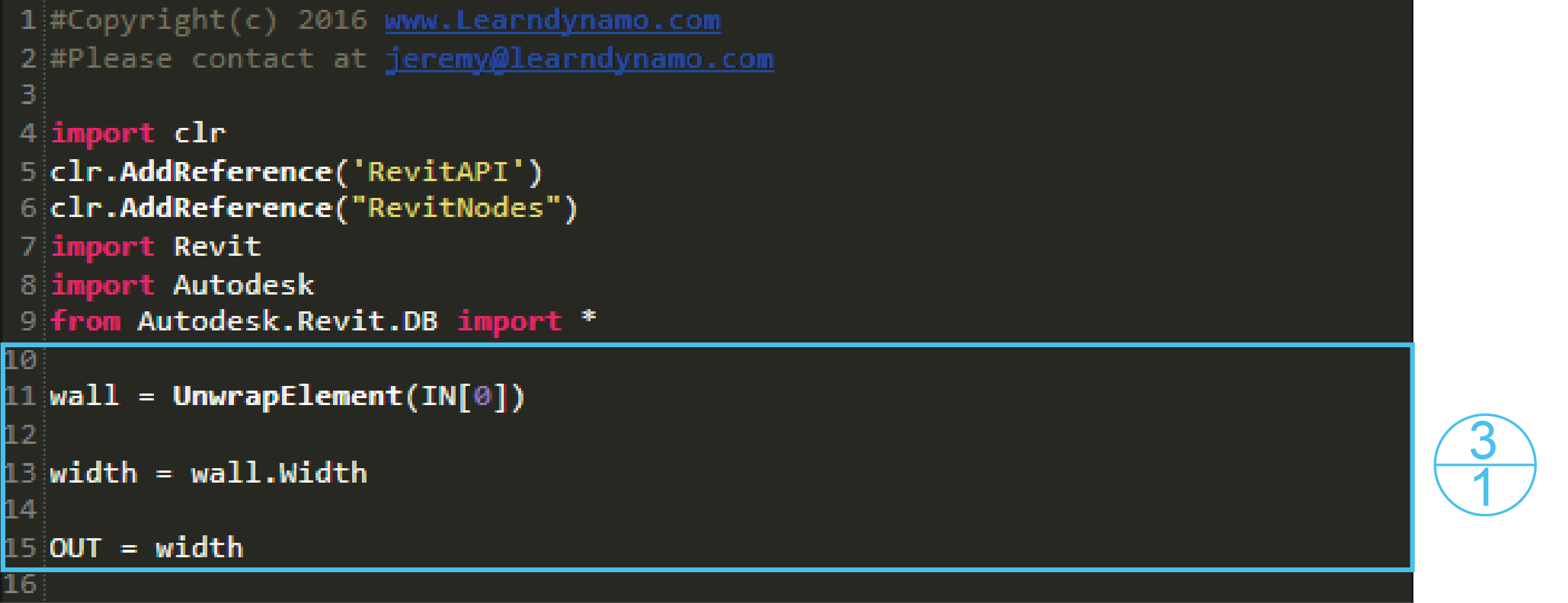 This simple script is used to get the width of the wall type input. The element is first unwrapped and set to the variable wall. The Width property of this wall type is then set to the variable width which is the output of the script. I’m sure, if you are getting handy with python, you should be able to reduce this code to one output line.