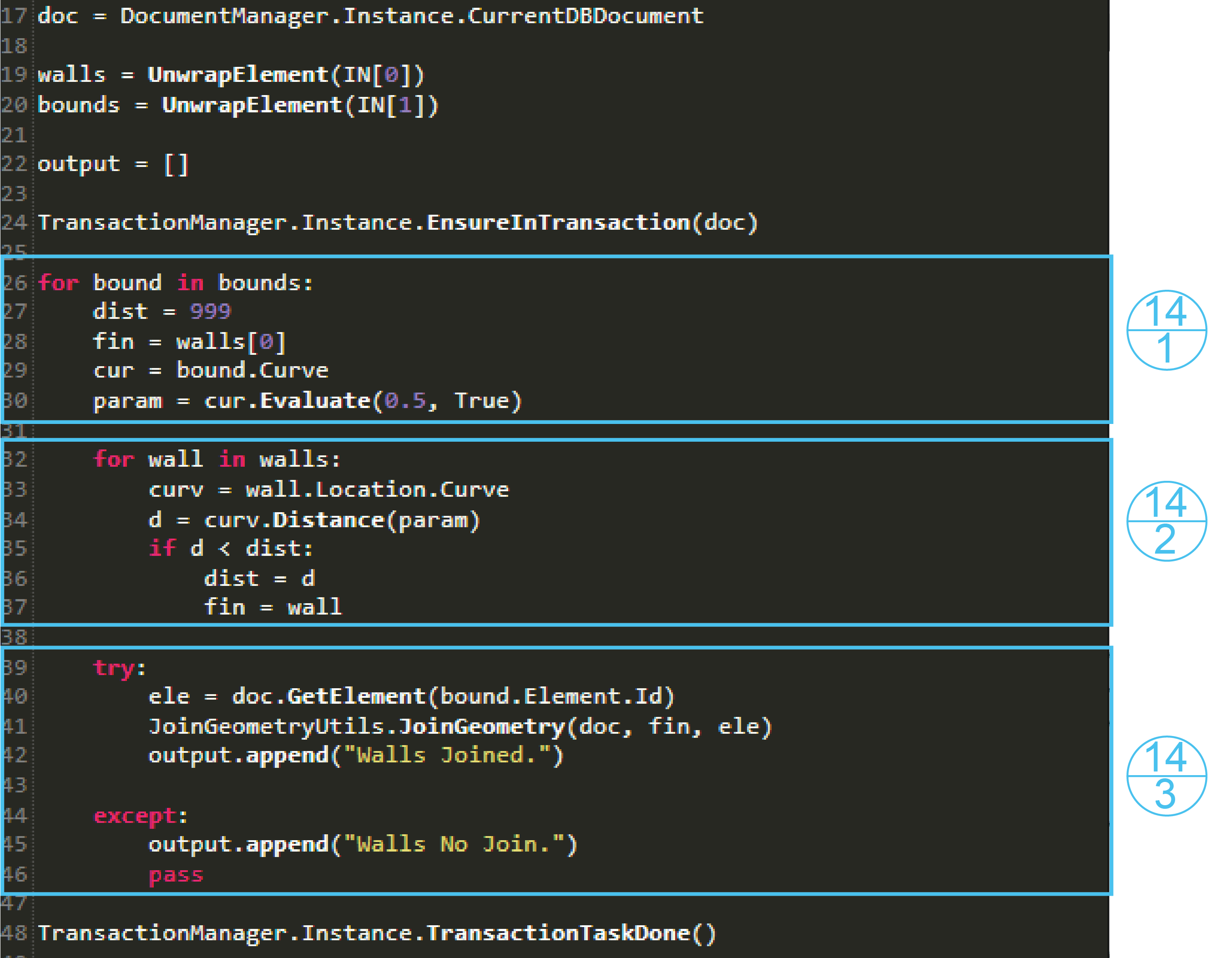 Once we have the wall finish closest to the boundary, we can try to get the element associated with the boundary by using the GetElement method and boundary Element.Id as the parameter. This retrieves the core wall so we can use JoinGeometryUtils.JoinGeometry to join the wall finish (fin) to the core wall (ele) in the document (doc). If successful, “Walls Joined.” will be appended to the output list, if not, “Walls No Join.” will be appended.