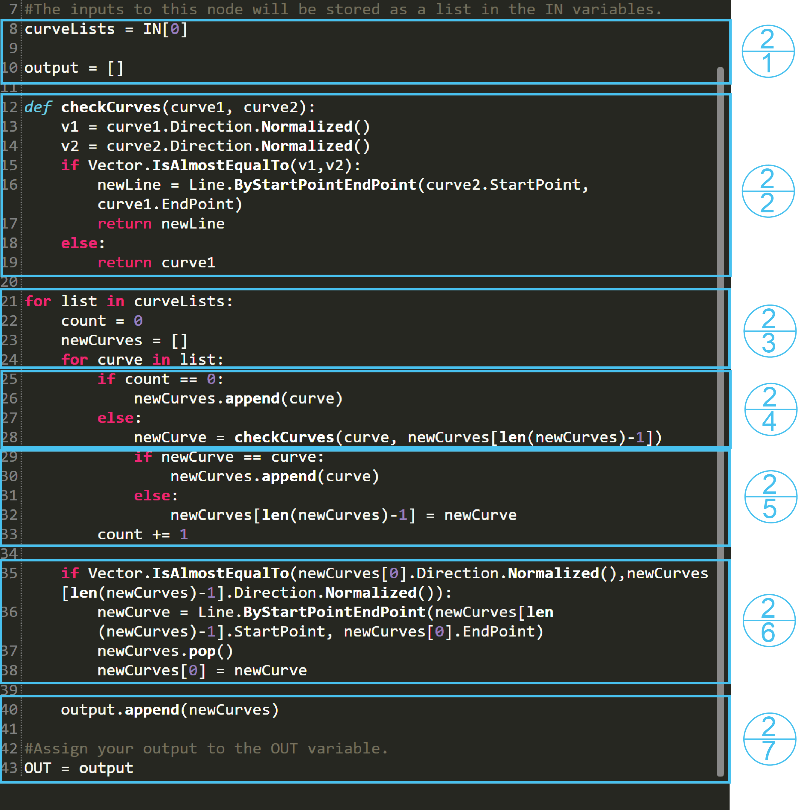 Next, we need to define a function that will test the direction of two curves so we can smooth them into one curve. To do this, using the def keyword we create a function named checkCurves with parameters named curve1 and curve2. Next we need to normalize the direction vectors of both curves by first getting the curve Direction and then using the Normalized() method, storing the result under the v1 and v2 variables. This will make it simpler to compare the two vectors. Using an if statement, the Vector.IsAlmostEqual is used to check if both curve directions are the same. If so, a new line is created with the StartPoint of curve2 and EndPoint of curve1 which is stored under the newLine variable. If the vectors are equal, this newLine is returned and if not, curve1 is returned. The function will soon be used to check all the curves in our input curves.