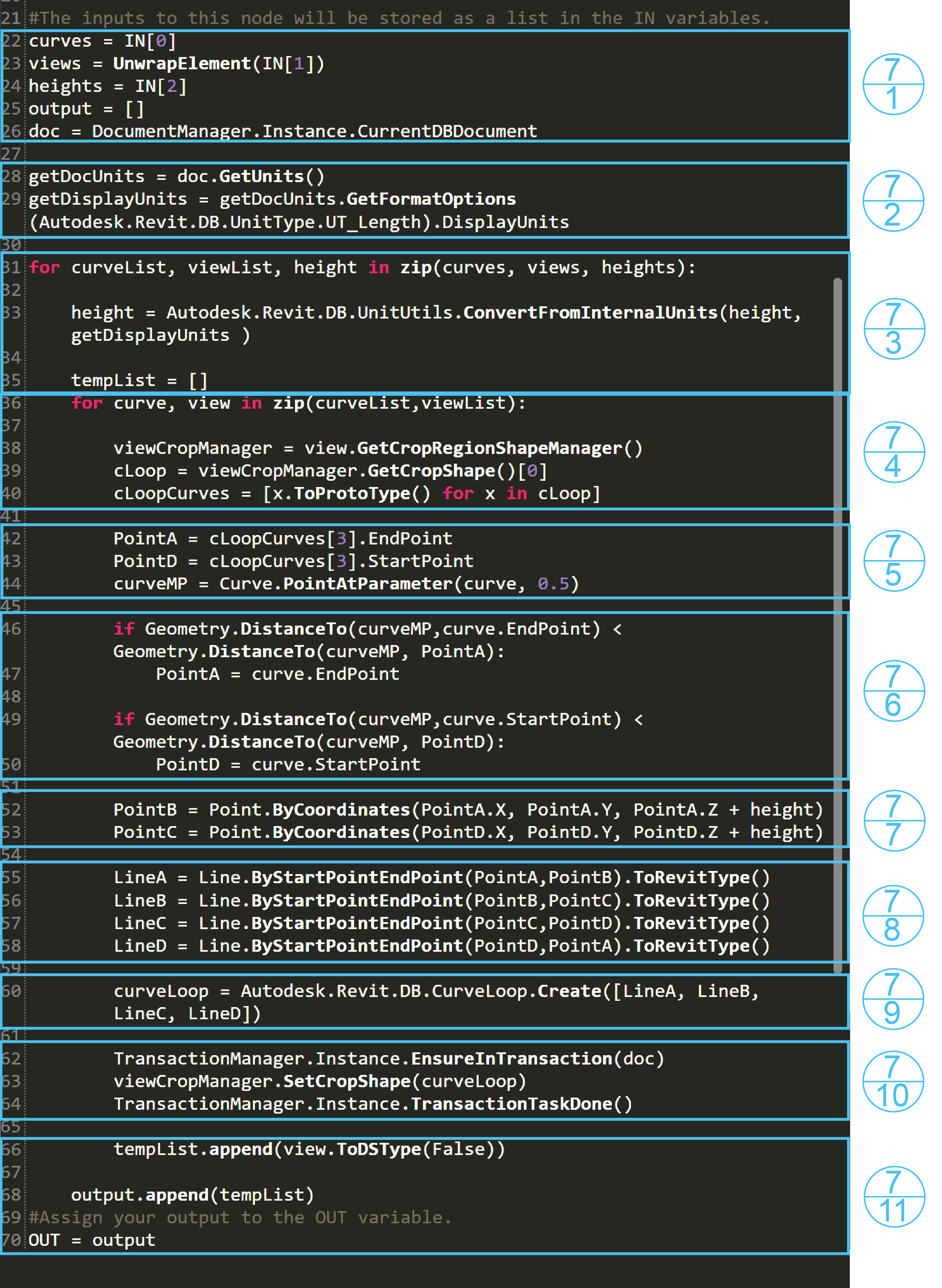 This script is needed to adjust the view crops of each elevation so they are suited to the wall they are elevating. To start, all of inputs are stored under curves, views and heights variables, with the views being unwrapped to work with the Revit API. Next we create our empty output list and the revit document is retrieved and assigned to the doc variable.